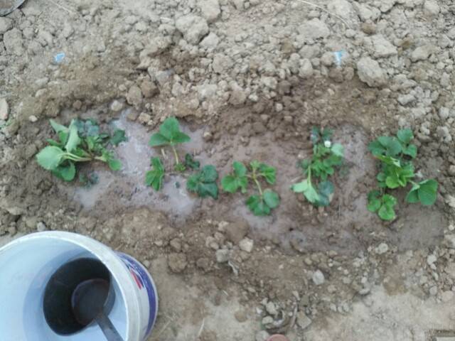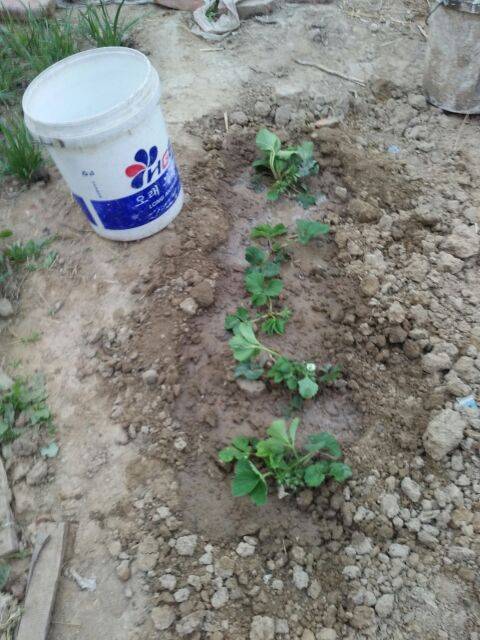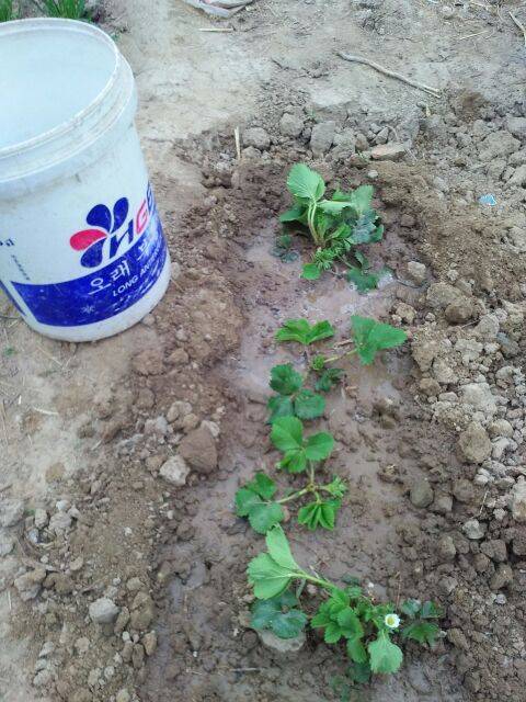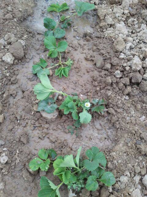 满街卖又大又红的草莓,不敢买,还是自己种放心。我看见了一朵小花,应该很快可吃到草莓了!