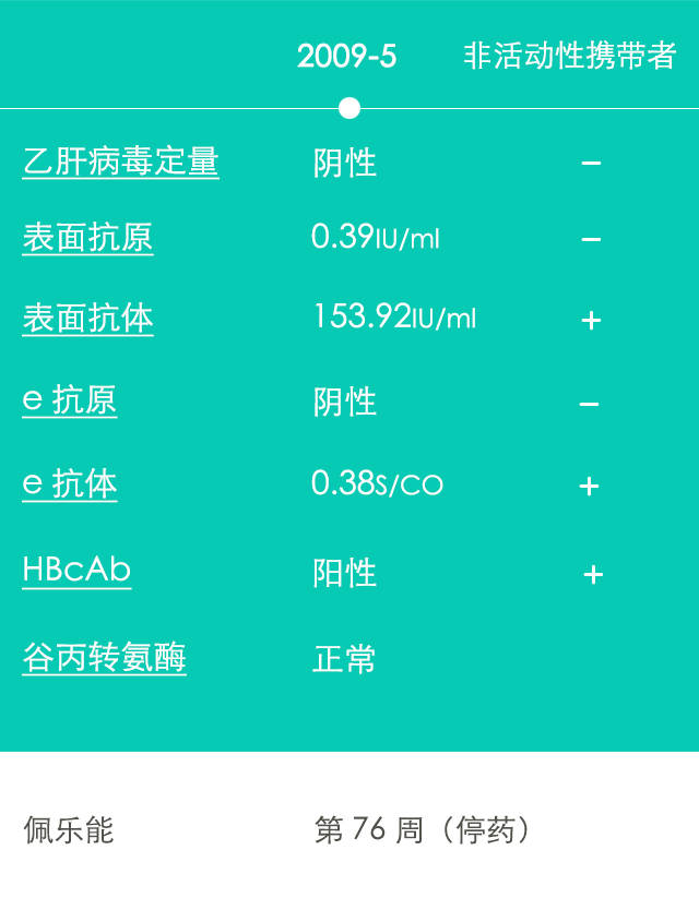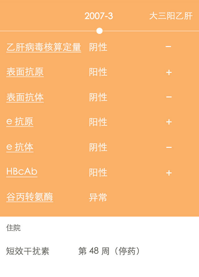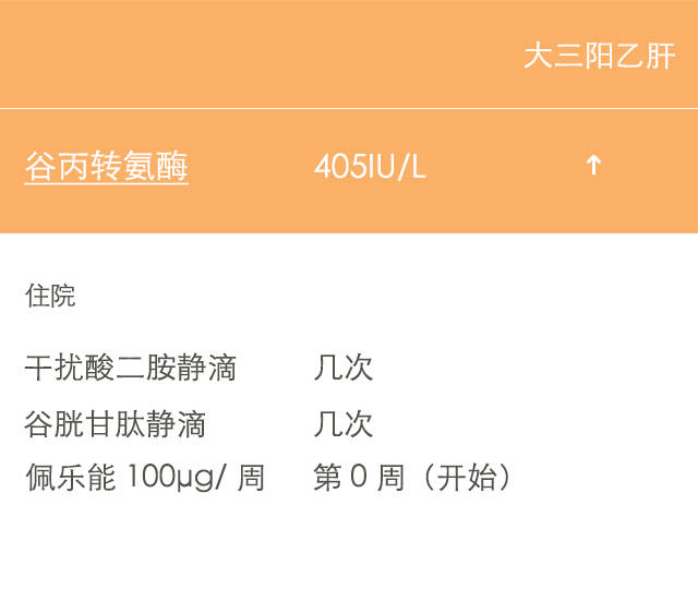 年龄40,男,多年以前发现“大三阳”,由于肝功能正常,未予以进行治疗,但是没有每年数次定期检查。而肝功能异常以后,患者以干扰素进行抗病毒治疗,但是一开始没有成功,后来其医师根据具体情况更换了治疗方案,最终该患者获得金牌。