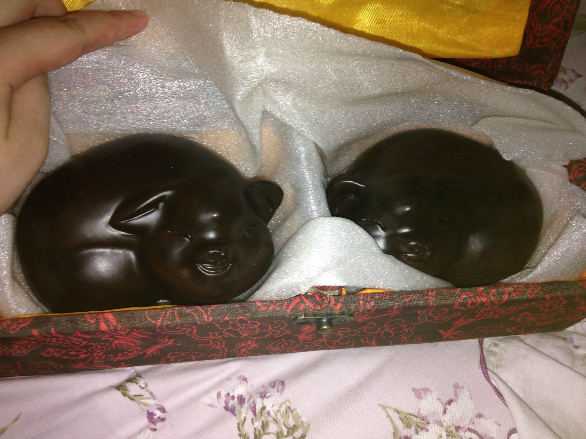 为了让我开心,他亲手雕了两只小猪寄给我,他说看见小猪的笑容你也会笑的
