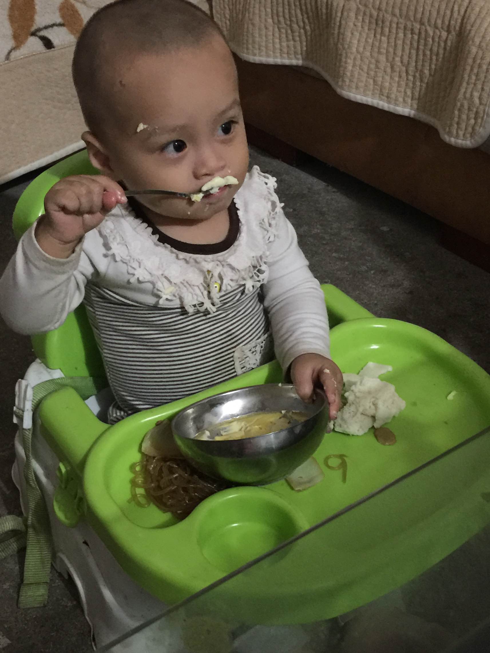 图是孩子自己吃饭,很欣慰。一岁四个多月,自己吃了一碗半布丁,肚子圆鼓鼓。哥哥吃的少,没拍。