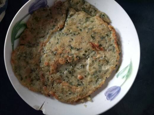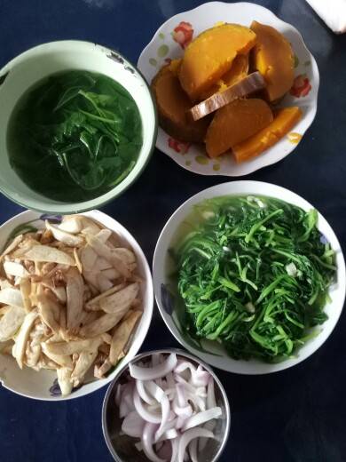 蒸南瓜,茭白炒肉,拌洋葱,青菜,冬寒菜汤,韭菜饼
