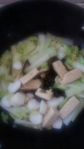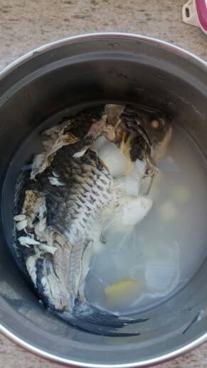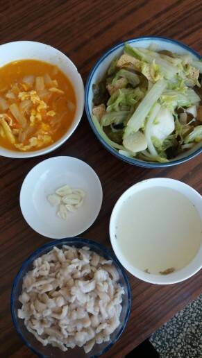 今天中午老公有饭局,我一人在家做午饭!主食是擦擦(白面、豆面、高粱面用温水和在一起,用擦子擦到锅里),炖鲫鱼汤,炒葱头鸡蛋西红柿,烩白菜冻豆腐长山药海带,营养还行吧!😛