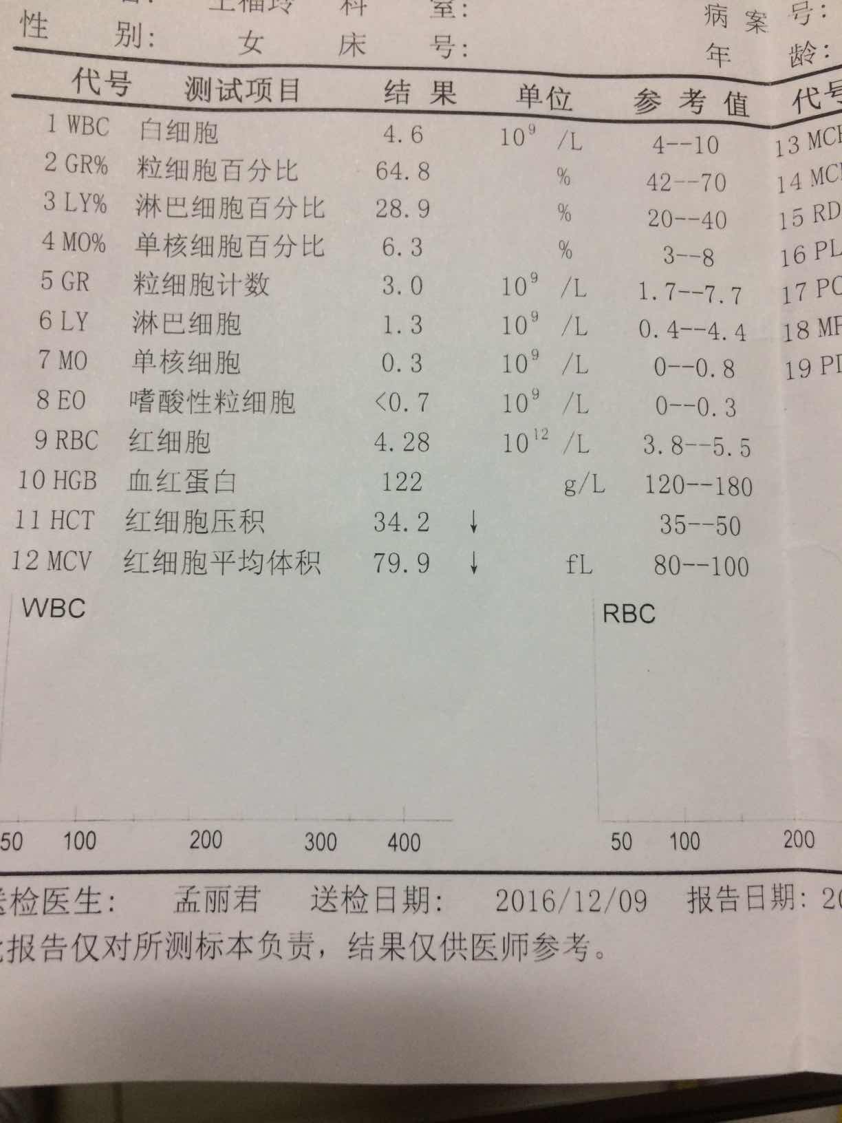 最近看到群里的姐妹化疗完小白低,感觉一点办法也没有只能打针,我想把我的小经验介绍给大家,不知能帮上姐妹们不?,化疗完3-5天小白开始掉,所以化疗完就开始食补➕药补,我的经验是每天一个海参,可以小米海参粥,也可以海参炖鸡蛋羹,我把黑米黑豆小红豆黑芝麻等磨成粉,每天早晨冲着喝,可以加奶粉,几乎每天烤红薯,几乎每天下午五红汤,隔一天绿茶隔一天灵芝红枣玫瑰花泡水,多吃蔬菜水果,少吃肉,多补胶原蛋白,在家2周就好买了2次猪手,家里也有胶原蛋白口服液,我每天吃2种以上水果,2天不重样,但那天都有苹果,蔬菜种类尽量多,还有锻炼身体,多走路,注意保暖,尽量少感冒。我这次化疗完感冒发烧了3天,还牙床肿痛,嘴唇肿,估计是液体在体内堆积的多了,对身体伤害太大,但也得抓紧补,能不打针就不打针。每次住院前验血,小白正常。还有就是从化疗开始我一直在吃辅酶Q10和护肝片。这是我时隔3天的化验报告,小白升的挺快,大家能看见日期的6号的和9号的。