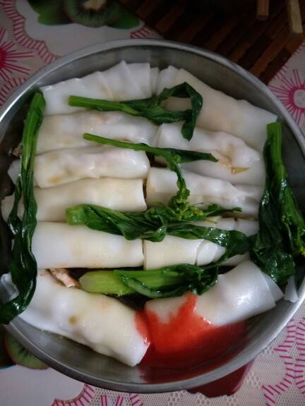 先说肠粉😁,把买回来的肠粉,洗洗,打开,把要加的材料准备好,我加了肉肉,喜欢的,可以加点红罗卜颗粒,或者切到细蔬菜也可以!铺到布肠粉上面,在卷起来,切成短!碟子加油,刷一层,把切好的肠粉,在碟子滚一圈,放好,铺好,就可以蒸啦!