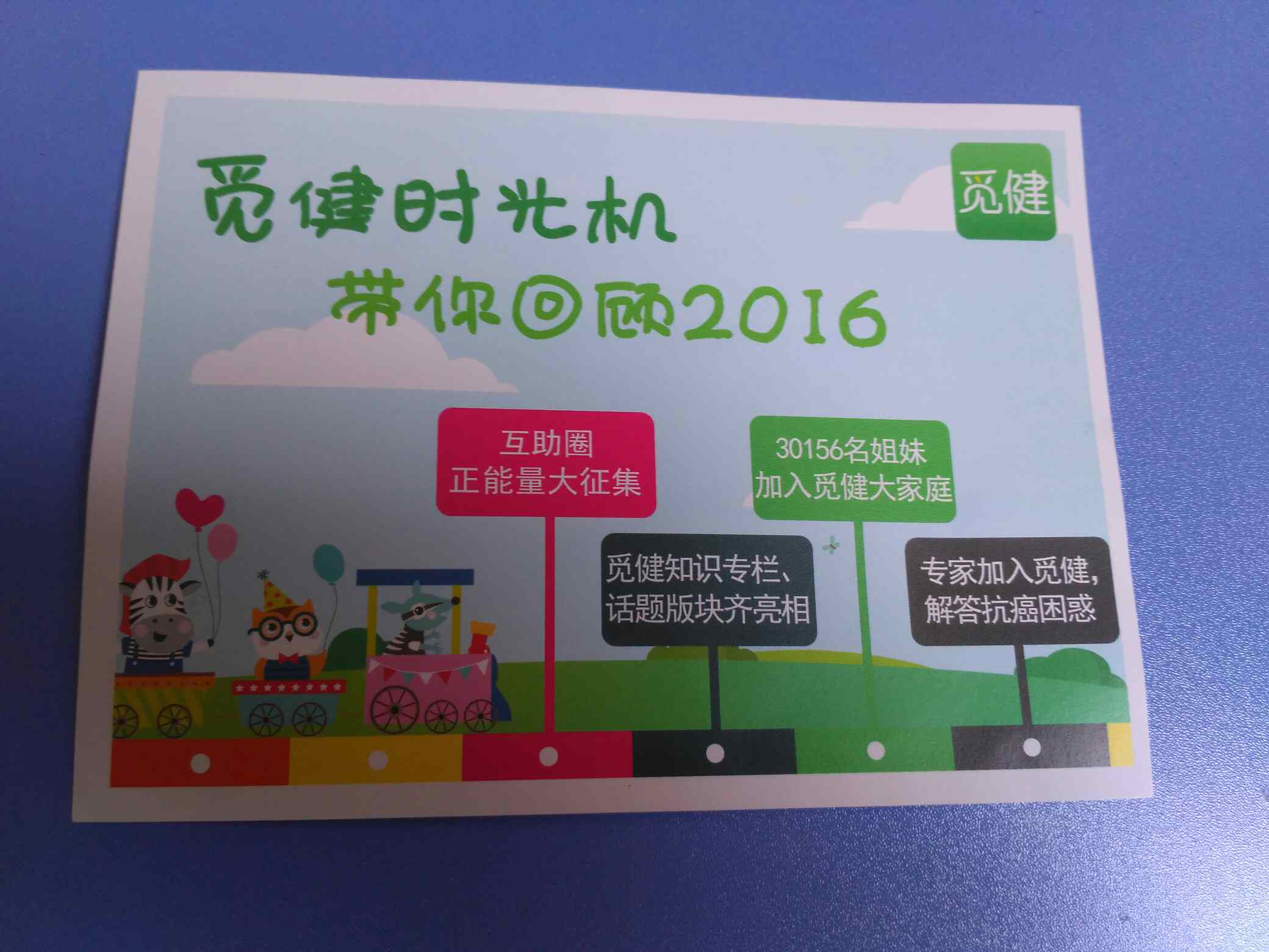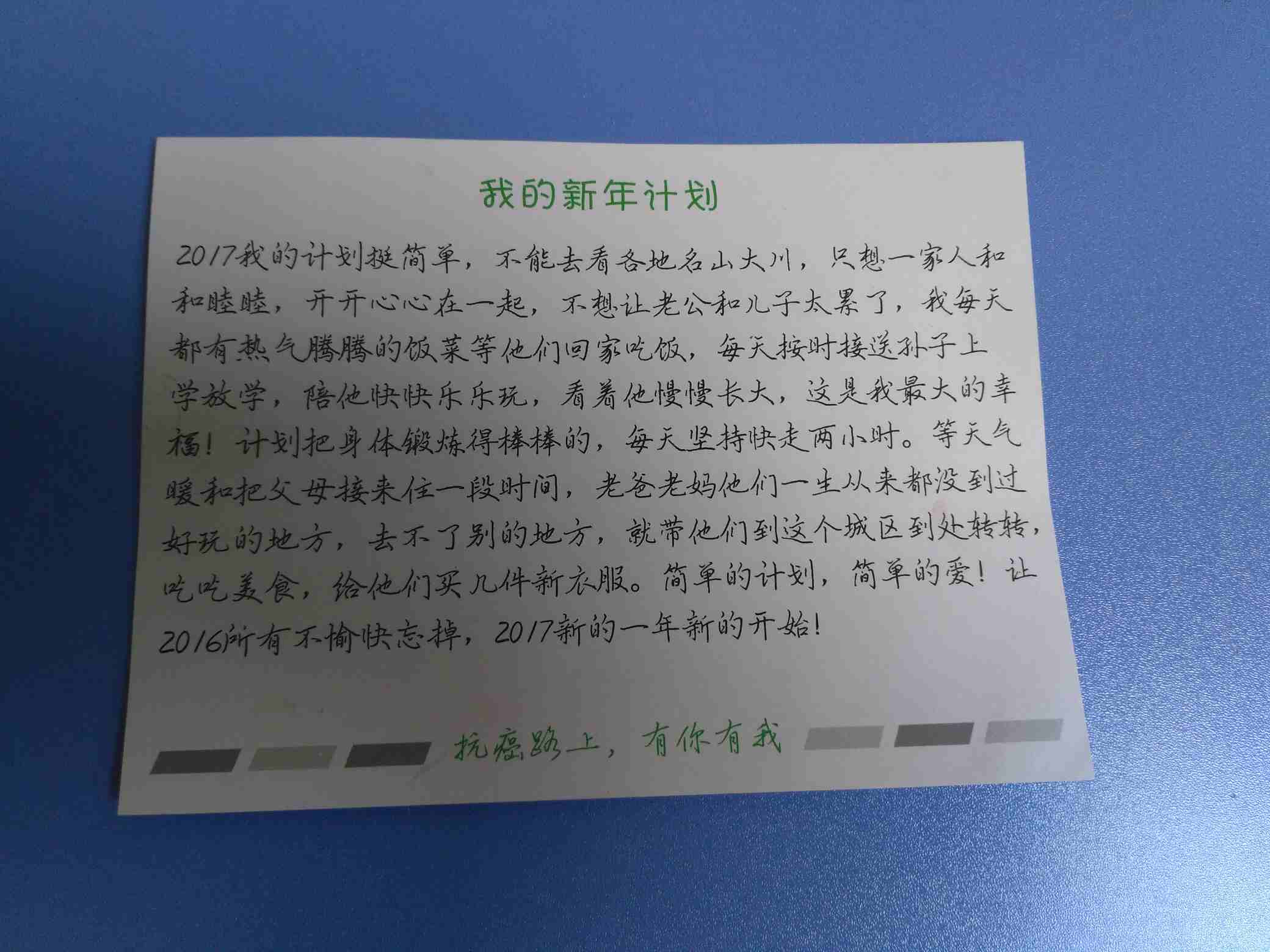 姐妹们大家中午好!我的新年计划明信片收到啦!感谢觅健!感谢互助君!互助君您辛苦了!我会按照我的计划完成的。姐妹们抗癌路上,有你有我!2017我们一起加油!美好的明天越来越精彩!