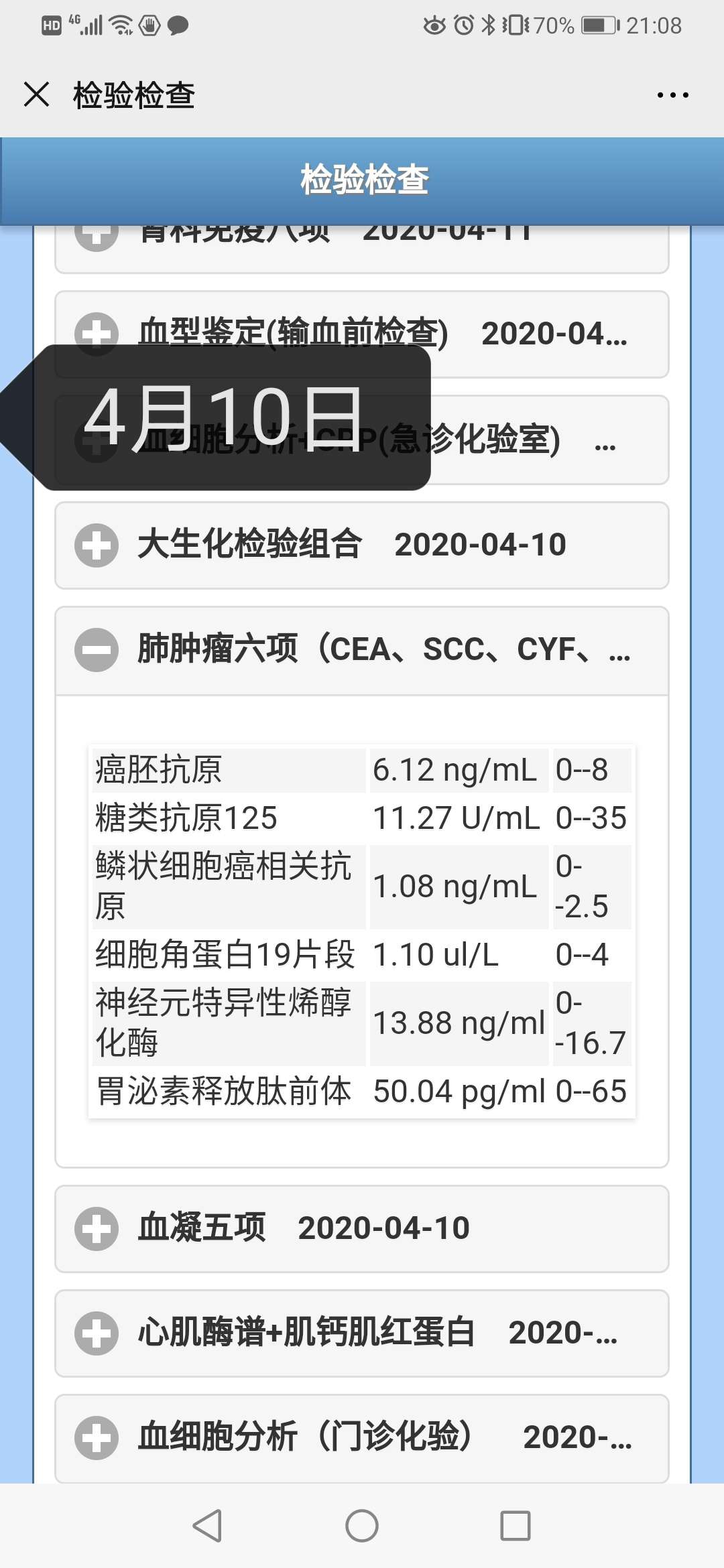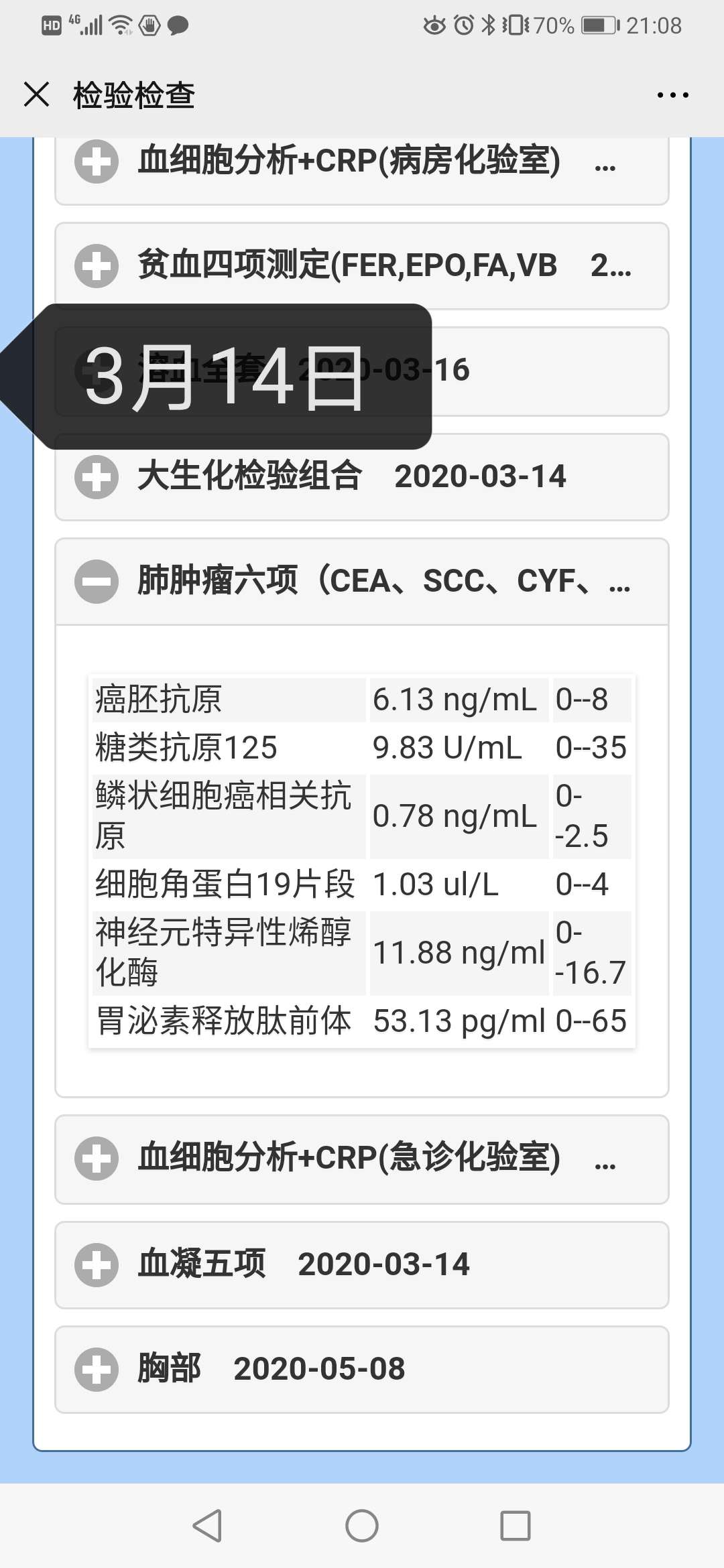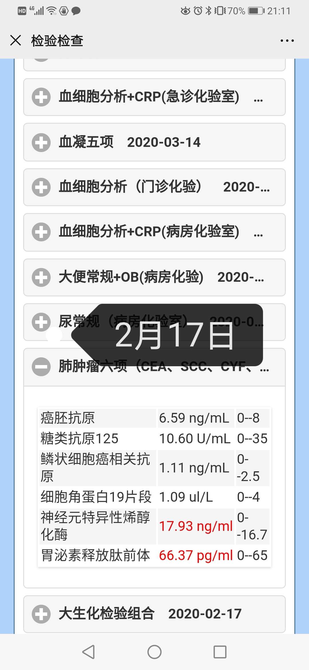 近几次的肿瘤标志物是多少?发上来。
