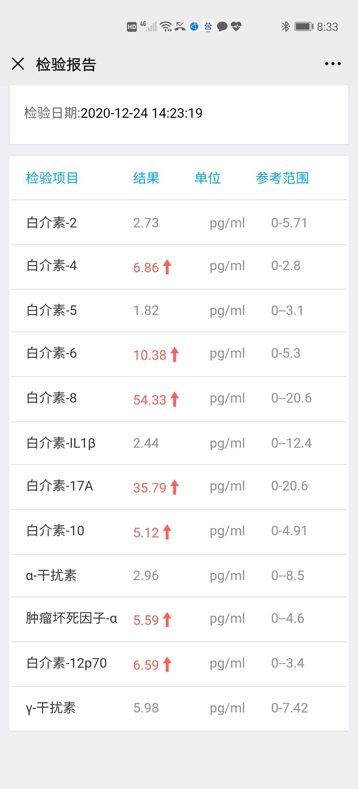 我是浸润型乳腺癌二级手术后,经过了化疗、放疗治疗,放疗前到现在一直都在吃内分泌药,刚进行了放疗后的第一次三个月复查,发现血液中白介素指标全面超标飘红,之前放疗前和放疗结束的时候也检查了这些项,也有超标项,但只有两三项,其余大部分指标都正常。请问病友中有出现我这种情况的没?不知对这些指标超了严重不?