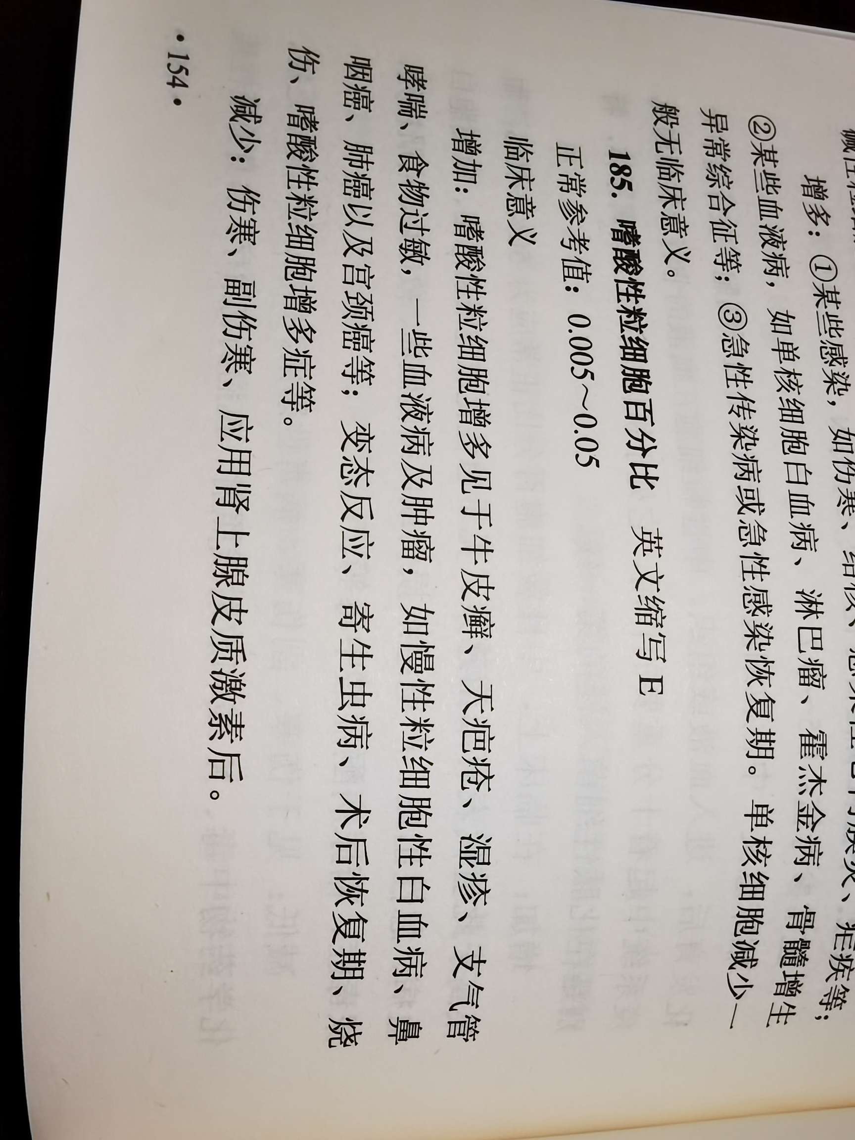 嗜酸性粒细胞升高原因:1.生理性变化:正常人嗜酸性粒细胞白天较低,夜间较高。上午波动较大,下午比较恒定。2.变态反应性疾病:可发生轻至中度的嗜酸性粒细胞增多,常见于支气管哮喘、荨麻疹、血管神经性水肿、血清病、花粉症等。3.药物引起:一些药物反应可导致外周血嗜酸性粒细胞增多,如抗疟疾药、β- 内酰胺类、环丙沙星、糖肽类抗生素、磺胺类药物、抗结核药物、心血管药物、抗惊厥药等。4.感染性疾病:寄生虫感染、某些真菌感染、逆转录病毒感染、结核杆菌感染等。