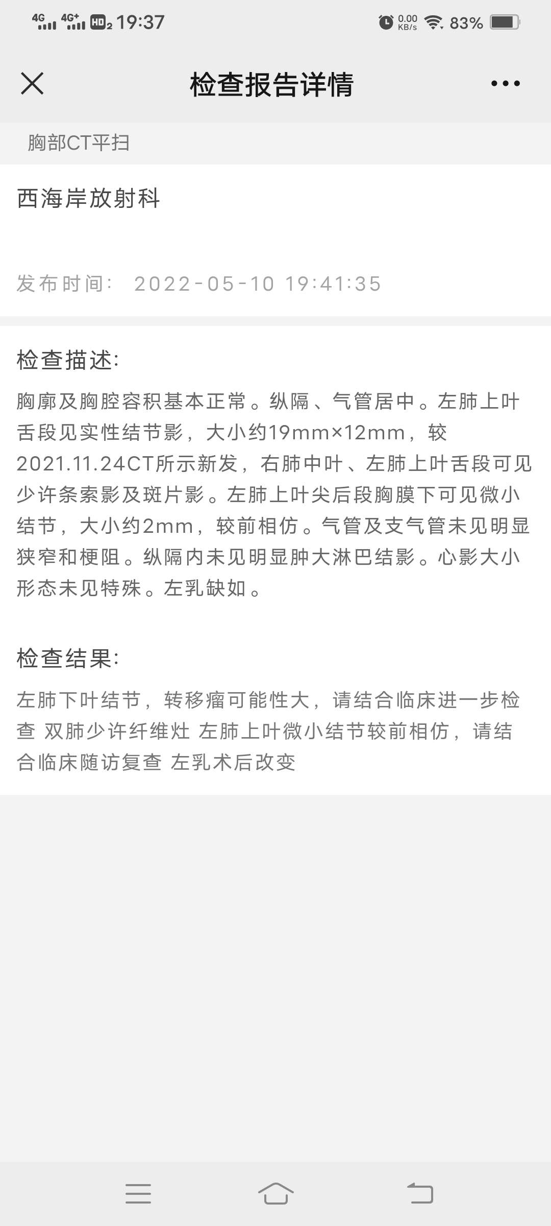 (11)你这个影像都说是左肺上叶有结节,最后结论说左肺下叶考虑转移,建议再找医院做个CT看看