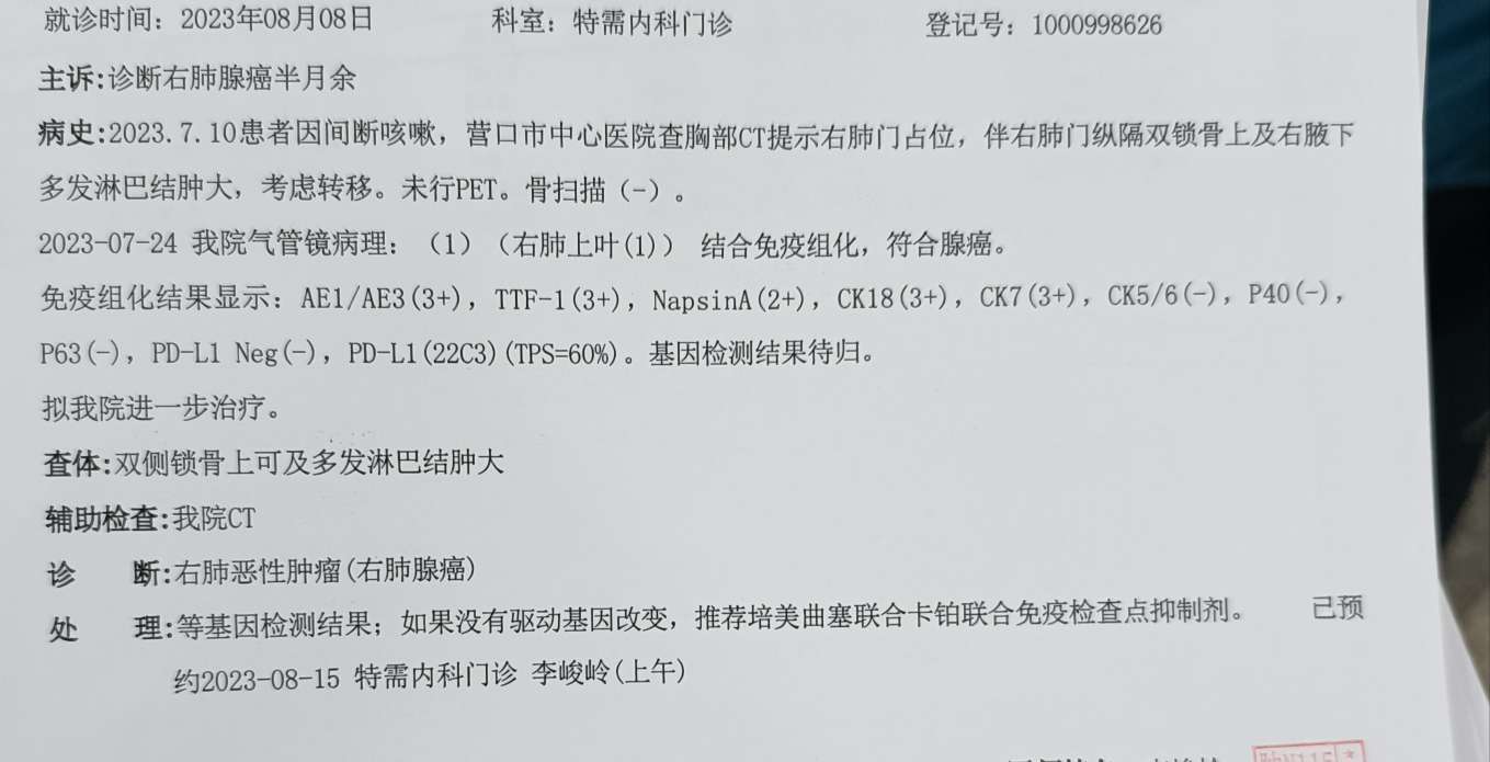 补全你们家的检查报告截图。1、病理免疫组化。2、基因检测报告。3、PDL-1免疫组化报告。4、近几次肿瘤标志物对比。5、胸 腹CT报告、头部加强核磁检查报告。