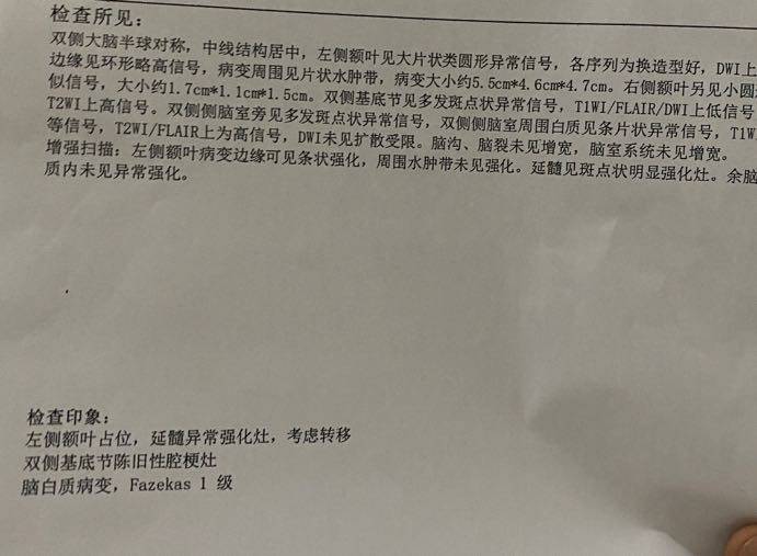 点赞(0) 举报这是5月28号发现时候照的加强核磁,做了20次全脑放疗后,8月11号复查加强核磁结果那个最大的小了1cm,是4.4cm,医生让两个月后再复查,约的时间是10月底照。如果再小了话,就去做射波刀。但是现在意识清楚,不说话,反应迟钝,要是说话声音特别小。咨询了一下放疗医生,说反应迟钝会是放疗原因,不说话不清楚怎么回事,给我气的。。。肿瘤放化疗医生,让我去宣武医院挂神经科看看,开点营养神经药。去年化疗开始,以及放疗都是在309医院做的。