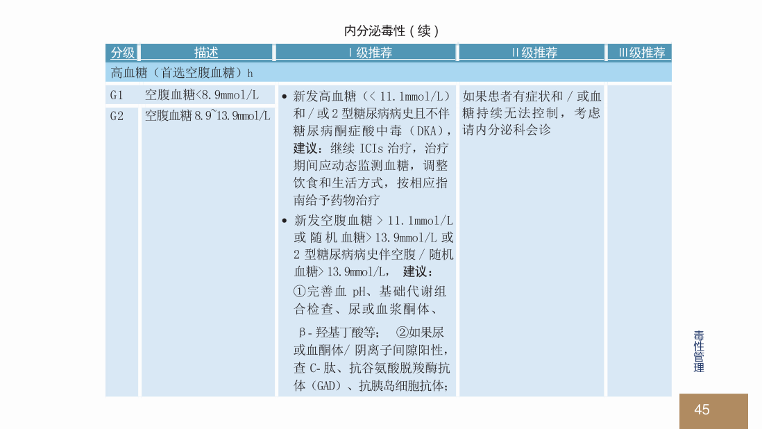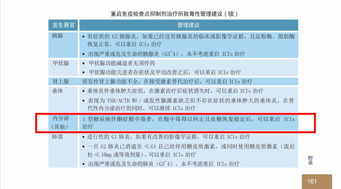 点赞(0) 举报免疫相关的糖尿病一般不会导致永久不能免疫治疗,即使是酮症酸中毒的,在纠正中毒恢复血糖后,仍然可以重启免疫治疗的。