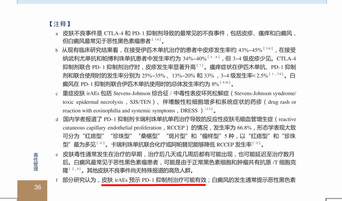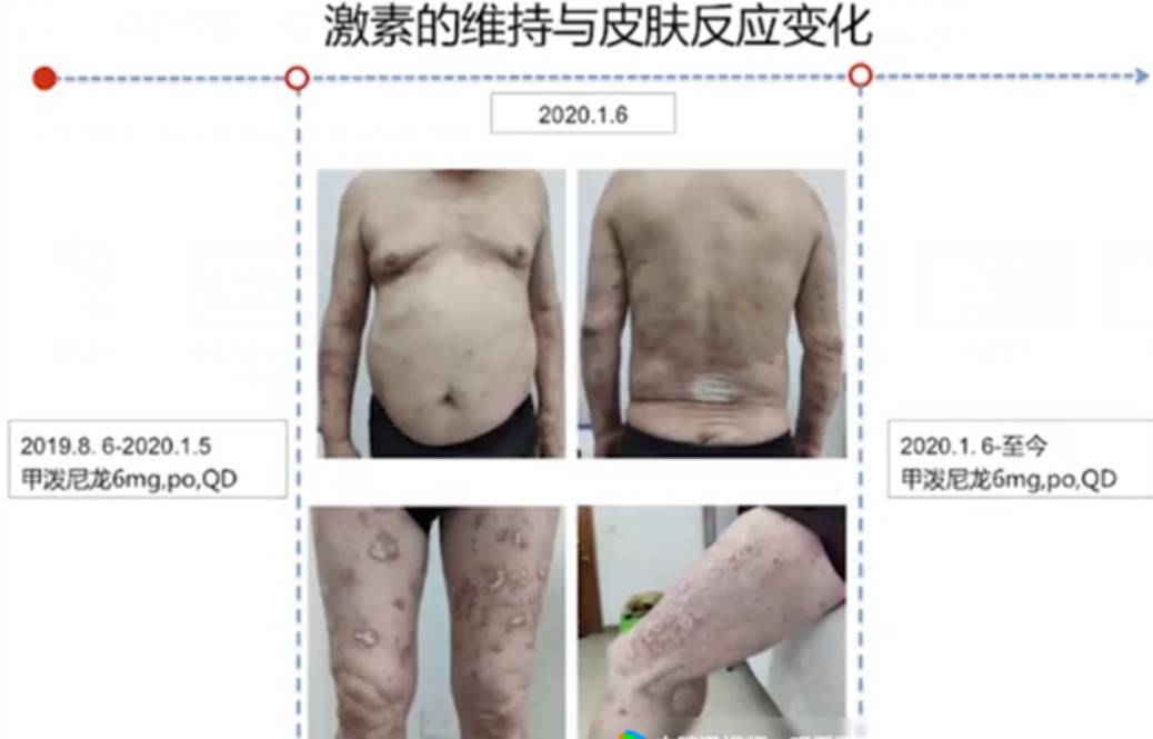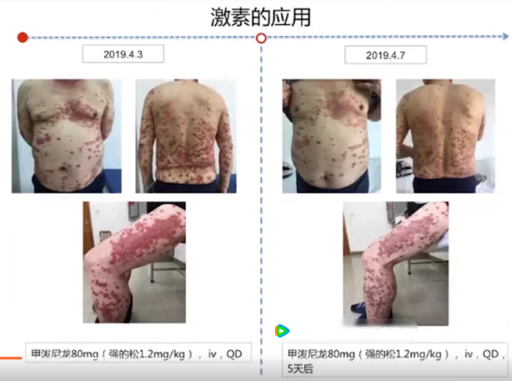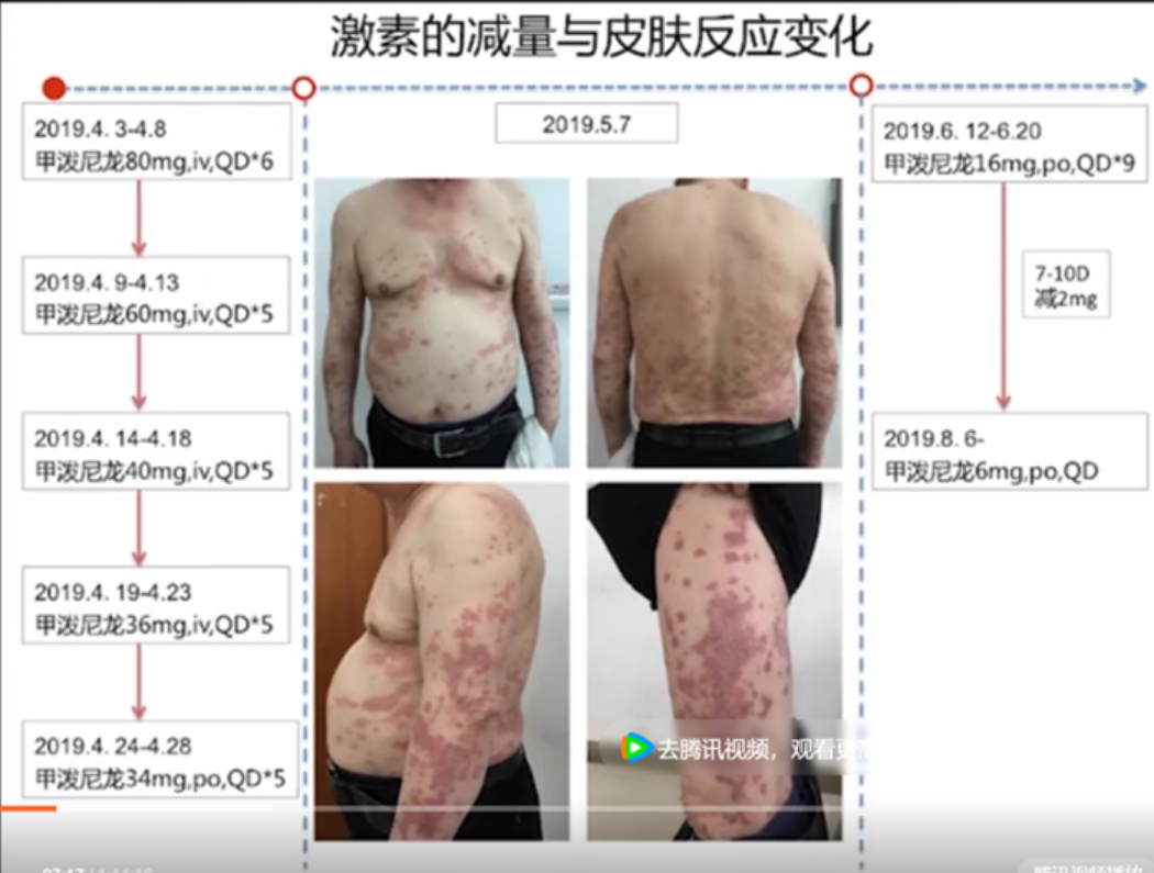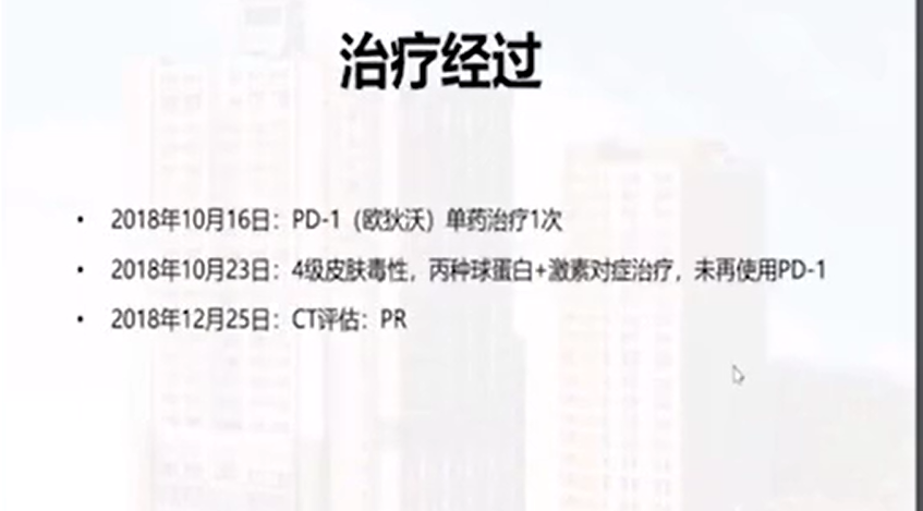 (21)用相片记录疗效,这么有心的人,我给你解释一下真正的原因。。。。。你这个是免疫治疗最常见的免疫相关的皮肤不良反应,免疫治疗会出现各种各样的副作用,皮疹是最最常见的,在所有的副作用里面排第一,看你的描述应该是不伴有瘙痒的情况。。。。。估计副作用程度不特别重,医生只给了口服激素,而且也消退了,后面治疗千万不用换药,原方案继续,出现皮肤副作用是免疫起效的一种潜在的提示。