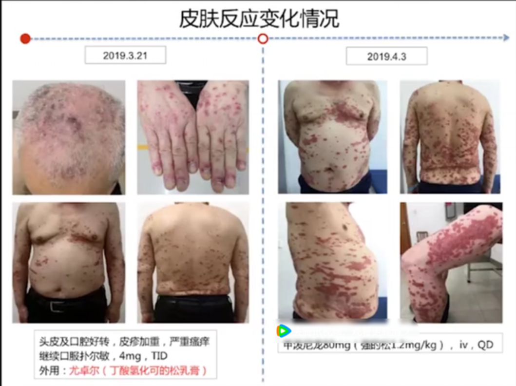 点赞(0) 举报给你看看其他严重的战友的情况。一个85岁高龄的患者,只用了一次免疫治疗,就出现了非常严重的4级皮肤毒性,然后也是用的激素和其它解救药物处理的,当然,他的抗肿瘤疗效也是非常的好,只打了这一针免疫,一年内再没用免疫,肿瘤病情控制也是比较稳定。