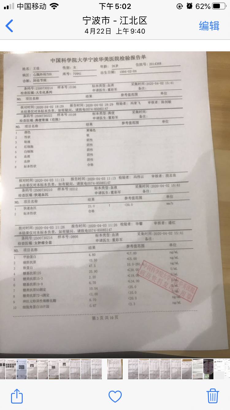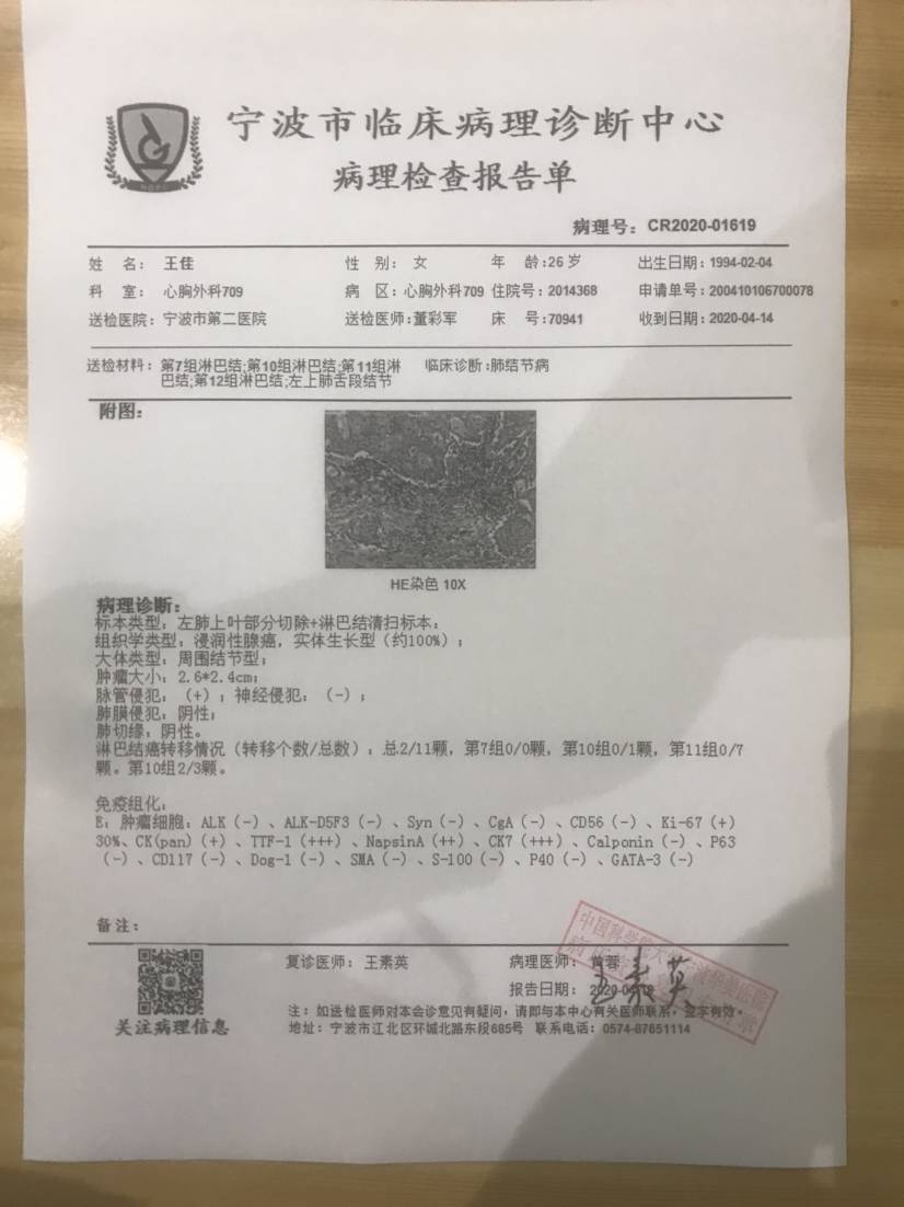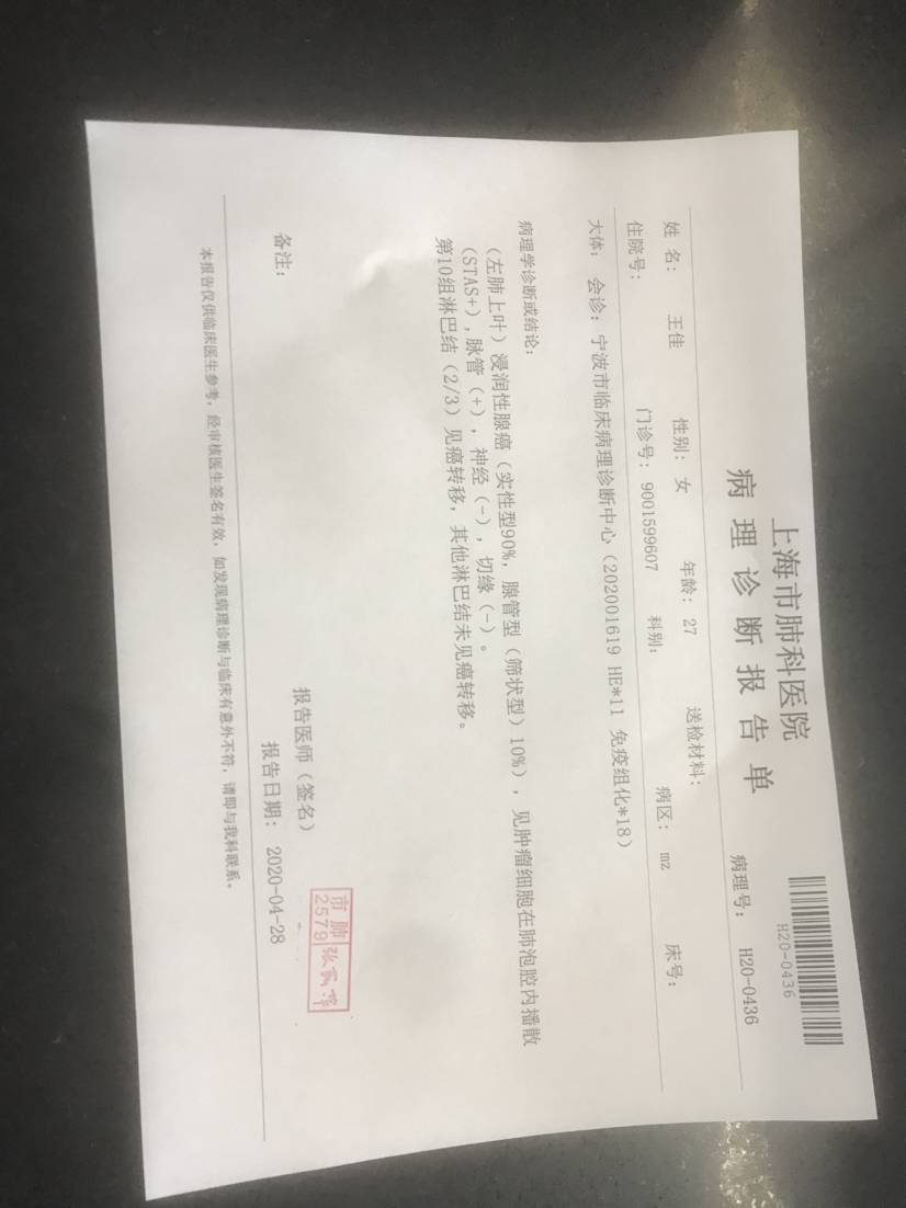 点赞(0) 举报这个是20天前的宁波的病理报告,后来我拿去上海肺科医院病理会诊的结果