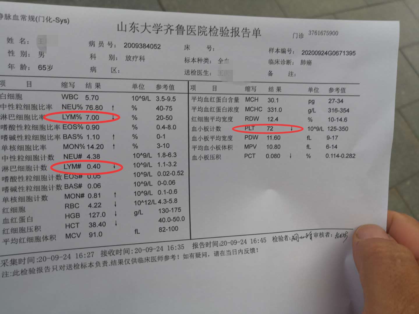 父亲今天上午放疗结束回家开始发烧,吃了退烧药后下午又开始发烧。去做了血常规,淋巴细胞比率特别低,血小板也很低。四天前打了两针长效升白针,所以白细胞正常。教授给开了两盒泰诺退烧药就让回家了。 请问一下觅友们,这是什么原因引起的发烧?用不用抗感染治疗?继续发烧的话明天的放疗还做吗?