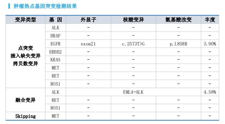 又有EGFR 21号外显子L858R突变,又有EML4-ALK突变,检测报告上面提示