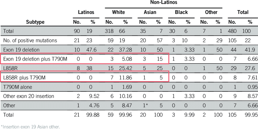 根据一项针对拉丁裔的对比研究[4],我们清楚的看到,亚洲人常见的EGFR基因突变,除了19外显子(delE746-A750)和21外显子的(L858R)以外,还有两个“合并突变”值得注意——