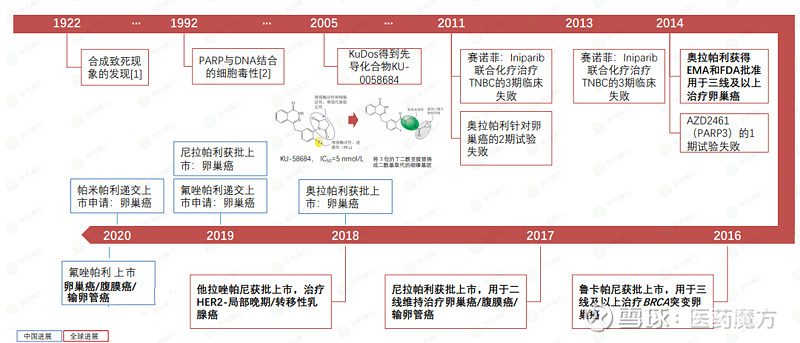 合成致死的概念最早在1922年提出,而PARP抑制剂早期是作为化疗增敏剂开发。2005年,合成致死得到概念性验证,PARP抑制剂进入崭新的研究领域。作为首个验证合成致死概念的靶标,PARP抑制剂的适应症已然拓展至多个瘤种。