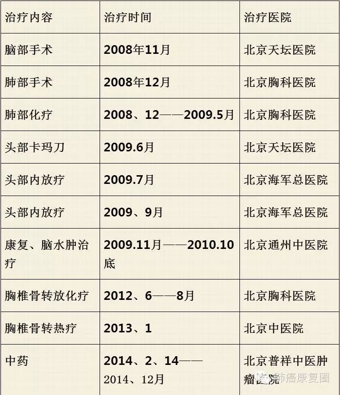 三、放化疗:肺部术后21天,开始做做化疗(卡泊 紫杉醇)六个周期;化疗于2009年5月结束,化疗的目的是清除体内残留的看不到癌细胞,防止术后因体虚导致的复发和转移。这六个周期的化疗,疗效显著,让肺部病灶稳定了5年没复发;第一个周期化疗的同时进行了全脑放疗(20次总剂量4000GY)。