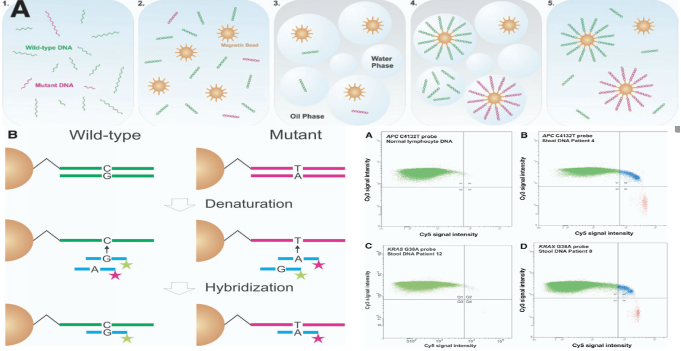 结合数字PCR与流式技术,利用特异性PCR引物扩增目标突变区后,与磁珠(磁珠上固定有特异的PCR 引物)混合进行油包水单分子扩增反应。反乳化作用后,利用不同颜色的荧光探针结合磁珠上的PCR产物,发出红色或绿色荧光,再利用流式细胞仪分析磁珠颜色来确定突变情况。