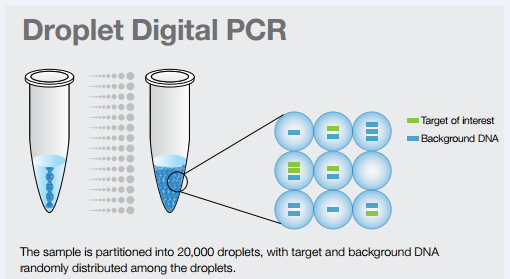 将一个标准PCR反应分配到大量微小的反应器中,在每个反应器中包含或不包含一个或多个拷贝的目标分子( DNA模板) ,实现“单分子模板PCR扩增”,扩增结束后,通过阳性反应器的数目“数出”目标序列的拷贝数。
