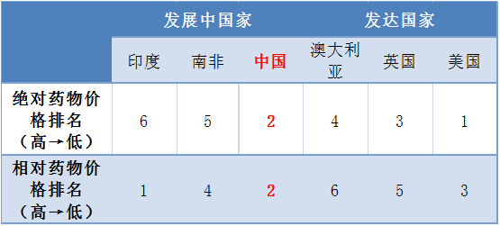表3 各国抗癌药物价格排名