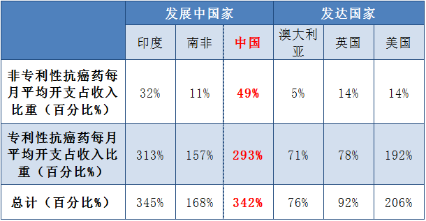 尽管在同种药物绝对价格上发展中国家较发达国家便宜,由于普遍收入水平较低,以药物价格除以人均GDP后(每月人均收入)得出抗癌药物相对价格后发现,发展中国家药物相对价格较发达国家高,其占比可高达每月收入的342%(中国)和345%(印度)。也就是说在例如中国或者印度这样的发展中国家,若罹患癌症,人民每月平均需要花上收入的3倍多用于购买抗癌药物。