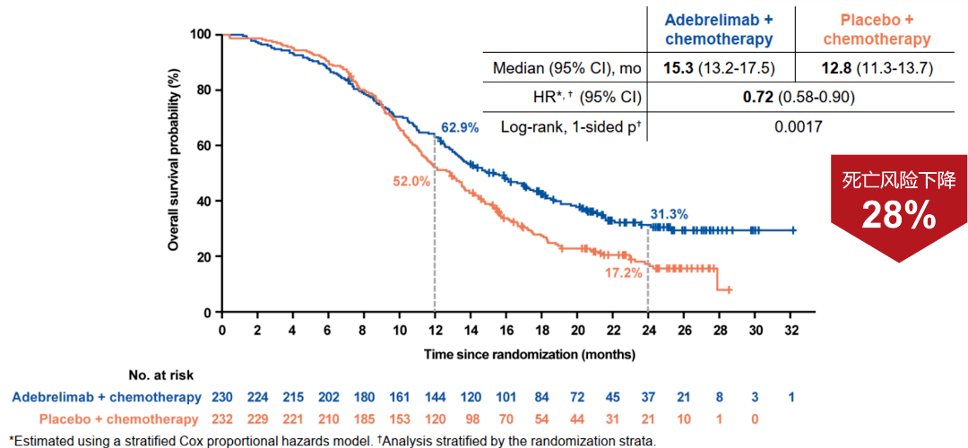 此次阿得贝利单抗一线治疗适应症的获批是基于吉林省肿瘤医院程颖教授和中国医学科学院肿瘤医院王洁教授共同牵头开展的一项多中心、随机、安慰剂对照的III期研究——CAPSTONE-1的成功。该研究提示,阿得贝利单抗联合化疗显著改善患者的总生存期(mOS: 15.3个月vs 12.8个月),降低死亡风险达28%,2年生存率达31.3%(vs 化疗17.2%),且具有良好的安全性,≥3级的irAE发生率均不超过1.8%。这一突破性成果也于2022年5月发表在《柳叶刀·肿瘤学》杂志,获得国内外学界的广泛认可。