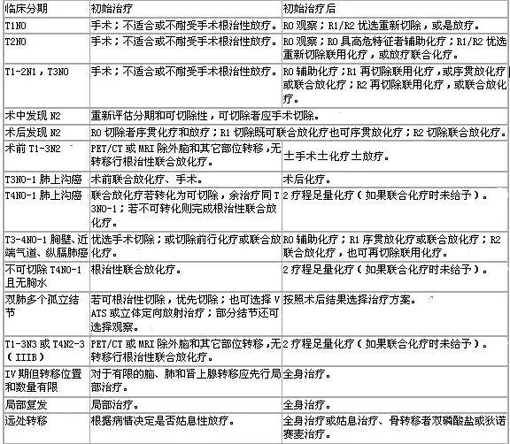 (3)术前临床分期 I/II 期而术后病理分期 N2 ,要根据切缘状态选择放疗与其它治疗形式联合治疗;或是术前不可切除的 T3N0-1 肺上沟癌术前联合放化疗后再行手术切除。