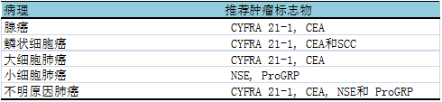 表2:根据肺癌病理学特点NACB推荐的肿瘤标志物