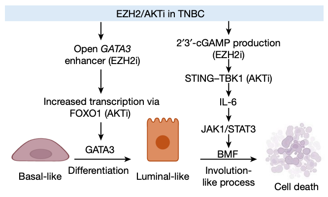 该研究表明,AKT抑制剂(AKTi)与EZH2抑制剂(EZH2i)可发挥协同作用,通过劫持乳腺退化机制选择性杀死三阴性乳腺癌,为这种高度侵袭性癌症类型的临床治疗开辟了新方向。