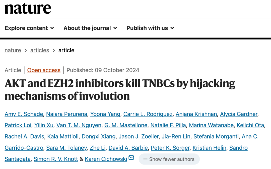 2024年10月9日,哈佛大学医学院的研究人员在国际顶尖学术期刊 Nature 上发表了题为:AKT and EZH2 inhibitors kill TNBCs by hijacking mechanisms of involution 的研究论文。
