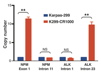 渐变性淋巴瘤激酶(ALK)的染色体重排是某些肿瘤的驱动基因突变,在2%-7%的非小细胞肺癌(NSCLC)和70%的间变性大细胞淋巴瘤(ALCL)存在有ALK重排,在间变性大细胞淋巴瘤里ALK的突变形式主要是形成NPM-ALK融合基因。