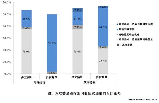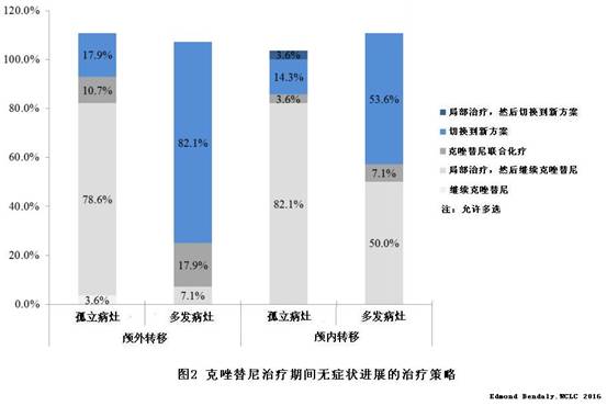 对于孤立病灶进展,不管有无症状,大多数医生选择局部治疗,然后继续克唑替尼。对于多发颅外病灶进展,不管有无症状,大多数医生选择换用新治疗方案。而对于多发脑转移进展,视颅外病灶控制情况而定。