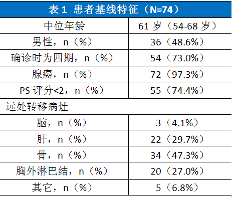 74例患者的克唑替尼中位治疗时间为10.6个月,肿瘤进展中位值为10.4个月,中位随访时间为15.6个月,影像复查间隔时间中位值为3.5个月,基线特征见表1。