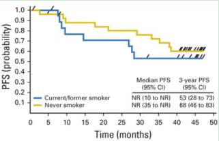 尽管非小细胞肺癌的研究和治疗领域新药层出不穷、疗效日益显著,但是对于晚期非小细胞肺癌来说,预后很不乐观。目前,中国晚期非小细胞肺癌患者的平均5年生存率为2%,即使在美国,5年生存率也仅为4%。 不过,最近关于晚期非小细胞肺癌的治疗进展方面,不断有利好消息出现,使得疾病控制不再只是梦想。 Alectinib可使62%的ALK突变晚期非小细胞肺癌控制时间超过3年 与EGFR突变不同,在中国非小细胞肺癌患者中,ALK 突变的比例要低很多,约为3%~8%。由于突变率较低,药物也相应较少,中国患者将ALK突变称之为黄金突变。 目前针对ALK突变的患者来说,除了国内批准的克唑替尼之外,还有一种新药可以使62%的ALK突变晚期非小细胞肺癌患者的疾病控制时间超过3年,就个疗效喜人的药物就是Alectinib(阿雷替尼)。 近期发表在大名鼎鼎的JCO杂志上的一项研究结果显示,来自AF-001JP研究的46个患者,服用Alectinib后,长期随访结果发现3年疾病控制率为62%,3年生存率是68%。而目前批准的ALK突变药物克唑替尼疾病控制时间仅为10.9个月(中位PFS时间)。 更有意思的是,Alectinib在接受过多于三种化疗方案的患者中,似乎疾病控制更好。但是3年后,两者又逐渐趋同了。 此外,在吸烟和不吸烟的患者中,Alectinib对于从不吸烟的患者的3年疾病控制率也高于吸烟的患者。 通过上述数据,我们看到ALK突变的晚期非小细胞肺癌通过Alectinib可以得到有效的控制。而对于没有EGFR或者ALK突变的患者来说,以PD-1为代表的免疫检查点治疗方法也显示出了令人欣喜的效果。 Opdivo可使16%的晚期肺癌患者生存时间超过5年 在2017年4月3日,第一份Opdivo治疗晚期非小细胞肺癌的5年生存数据被披露。在纳入的129名之前接受标准治疗无效的晚期非小细胞肺癌患者中(临床试验:CA209—003),使用Opdivo治疗后患者5年生存率高达16%。这就意味着,Opdivo将晚期非小细胞肺癌患者的五年生存率提高至8倍。(详情请见《相比传统治疗,PD-1将晚期肺癌5年生存率提高至8倍》一文) 另外,不少患者也都知道,目前Opdivo的有效率不是很高,约为20%。在这样的前提下,能使晚期非小细胞肺癌患者的5年生存率提升至16%,这不得不说是一个伟大的“功绩”,这也侧面反映出Opdivo一旦起效,持续时间会比较长。 最后,需要提醒大家的是,Alectinib和Opdivo均未在中国内地上市。