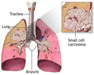 小细胞肺癌(SCLC)占所有肺癌病例的10-15%,SCLC是快速生长的侵袭性肿瘤。吸烟是与SCLC相关的最常见的危险因素。 肺癌通常有两种主要形式:小细胞肺癌(SCLC)和非小细胞肺癌(NSCLC),通常来说,NSCLC更常见,但是其预后比SCLC好。与SCLC相关的癌细胞比较小,并且肿瘤进展相对较快,这使得该种肿瘤在早期检测和诊断中具有很强的挑战性。 一般认为小细胞肺癌起源于支气管粘膜或腺上皮内的Kulchitsky细胞(嗜银细胞),属APUD瘤。也有人认为其起源于支气管粘膜上皮中可向神经内分泌分化的干细胞。小细胞肺癌是肺癌中分化最低,恶性程度最高的类型。多发生于肺中央部,生长迅速,转移较早。光镜下,癌细胞小而呈短梭形或淋巴细胞样,胞浆少,形似裸核。癌细胞密集成群排列,由结缔组织加以分隔,有时癌细胞围绕小血管排列成团。电镜观察超微结构,瘤细胞胞浆中含有典型的轴样神经内分泌颗粒,但颗粒的量多少不等,并证明和5-HT及ACTH有关。