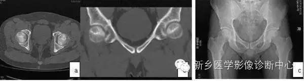 图2 CT显示坏死灶明显,硬化带形成(a,b);X线片坏死灶显示不清(c)