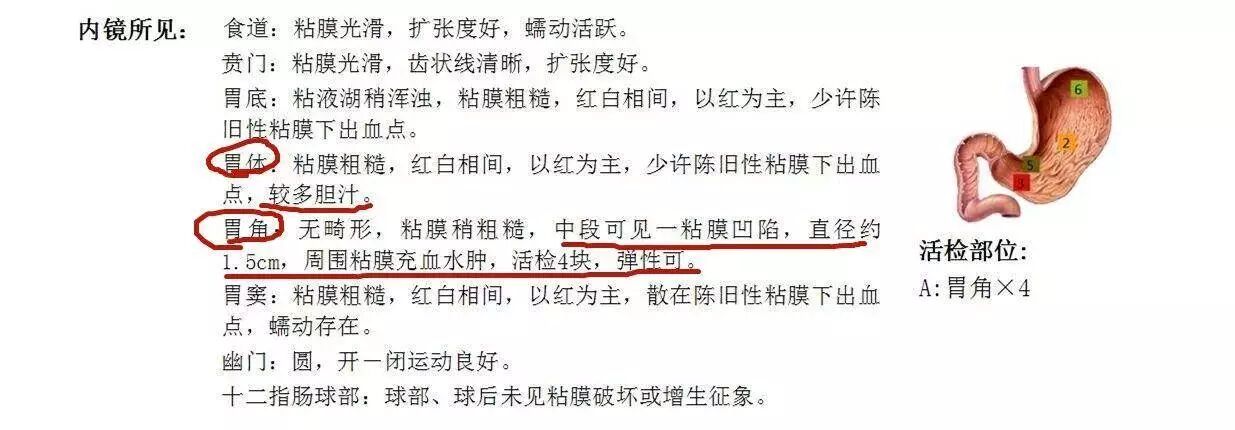 胃体后面写了较多胆汁;胃角写了中段见一黏膜凹陷......这就是你的问题具体描写。看完这个就知道了你的胆汁在胃体、溃疡在胃角,而且做了活检。其他文字基本的意思就是“正常”,你就不用看了。