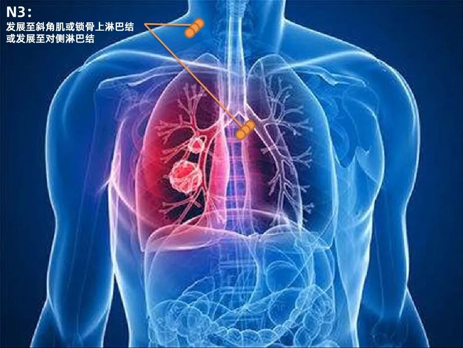 当淋巴结转移主要在胸内时一般判定为N1-2期,若转移淋巴结发展到对侧或胸外时则判定为N3期