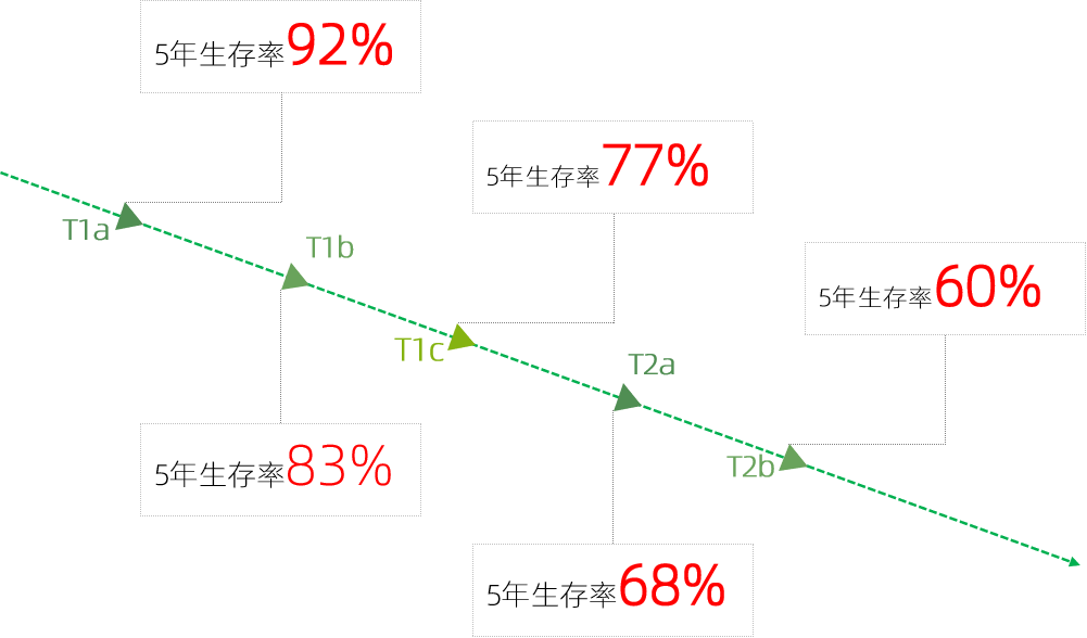 当肿瘤≤1cm(T1a)时,携带这样微小结节的患者,五年生存率高达92%,术后可以不用任何辅助治疗方式,只要定期监测就可以了。可是,随着肿瘤发展到2cm(T1b)、3cm(T1c)、4cm(T2a)、5cm(T2b)时,生存率就会直线下降至60%。它像一团笼罩在患者头顶的乌云,体积越大风险也就越大。