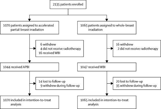 这项随机对照试验(RAPID)于2006- 2011年间在加拿大、澳大利亚和新西兰的33个癌症中心进行,2135名患者参与了这项研究,她们都是40岁或以上患有导管癌或淋巴结阴性乳腺癌的妇女,并且已通过保乳手术治疗。大约一半的患者被随机分配全乳放射,每天一次,持续三到五周;另一半接受外照射APBI,这被认为是局部乳房照射的最小侵入性方法,每天两次,持续五到八天。