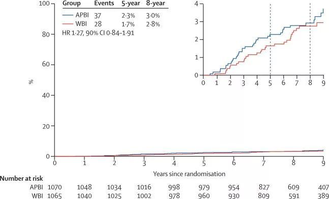 该研究是长期的,中位随访时间为8.6年。在第8年,两组乳腺癌复发的风险都非常低且相似。对于接受APBI治疗的患者,风险为3%;接受WBI治疗的患者,风险为2.8%。