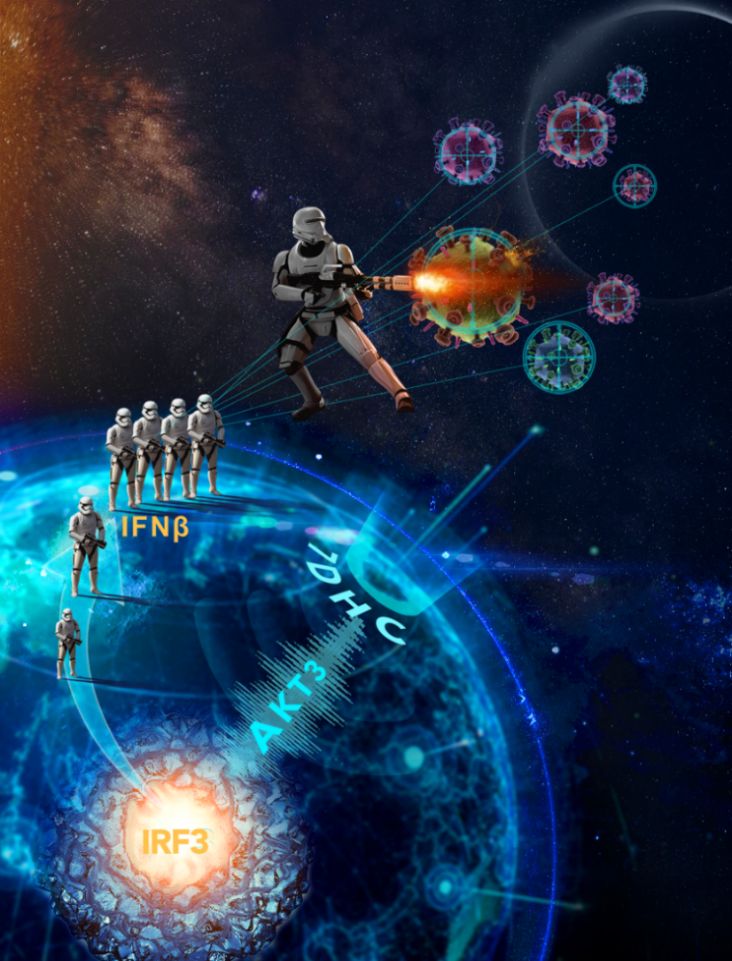 研究人员进一步探索了“信号通路”的构建,发现类似于“接力棒的传递过程”:7-DHC如同免疫卫士—巨噬细胞的膜表面的雷达,将病毒入侵“危险信号”,传递给巨噬细胞内蛋白激酶AKT3,促进AKT3活化;AKT3随即与负责基因转录的IRF3结合,告诉IRF3紧急产生更多的干扰素IFNβ。这种信号通路就像吹响的“集结号”,最终让巨噬细胞尽快清除入侵病毒。