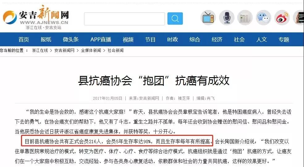 浙江省安吉县在2017年也曾报道过,通过协会“抱团”抗癌,5年生存率达98%,且生存率逐年提高趋势。可见,抱团抗癌带给癌症患者的力量是无穷无尽的。
