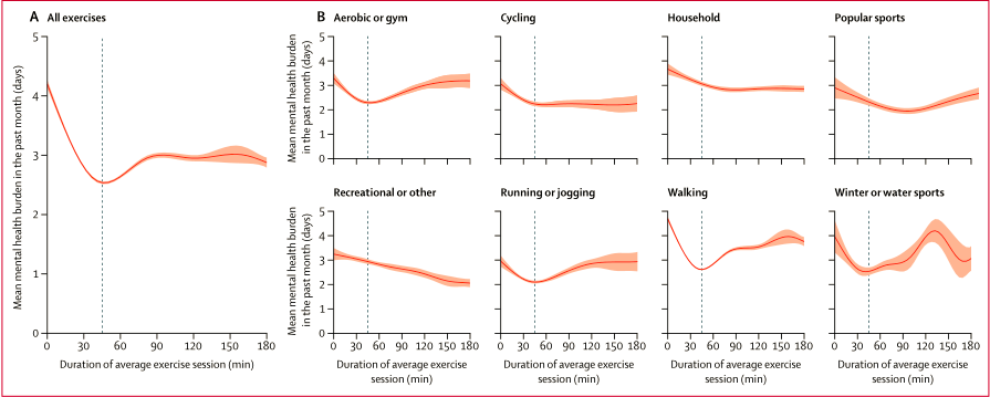 人是有情绪的,有时候难免会抑郁、不高兴,但是运动后心情马上就能愉悦起来。我相信大部分人都有这种感受。针对这个问题,国际顶级期刊柳叶刀给出回答:运动真的有益心理健康。美国CDC行为危险因素监测系统调查分析了来自2011年、2013年和2015年的120万余名18岁及以上的美国人数据。比较了运动和不运动的人自我报告精神健康不良的天数,并充分考虑了受试者的年龄、种族、性别、婚姻状况、收入、教育水平、BMI等差异。该研究一共纳入了75种运动,包含了绝大部分你能想象得到的运动。结果显示:与不运动的人相比,运动的人心理健康状况不佳的时间减少了约43%。另外,大部分的人可能与我一样,觉得长时间运动吃不消,坚持每天运动有压力,有时就想偷偷懒。而这个研究告诉我们,运动持续时间在30分钟到60分钟之间(峰值在45分钟左右)对精神健康最有益,多种运动都适用。但运动持续时间超过3小时的人比锻炼45分钟或不锻炼的人的精神压力会更大。此外,研究还观察到运动频率和精神健康负担之间呈现U型关系,即每周运动3-5次的人比运动少于3次或超过5次的人的精神压力更小。大多数运动都适用,与运动强度水平无关。所以,运动不必时间太长,也不必太频繁,不然达不到减轻压力的作用,反而还增加了心理负担。从时间长度来说,每次运动的最佳时长在45-60分钟之间,少于45分钟效果会减弱,大于60分钟不仅没有更高收益,还容易产生负效应。在频次上,一周3~5次,收益最高。不过,如果是散步,频次可以稍高一点,而且建议8000步以上。