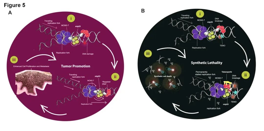 上图显示了MTP53 R273H、PARP和MCM2-7蛋白在复制DNA上的协同如何在肿瘤发展中发挥作用。在左图中,MCM2-7(以紫色显示),MTP53 R273H(以绿色显示)和PARP(以红色显示)与复制的DNA相互作用。当发生细胞损伤时,它们有助于促进异常修复,使细胞存活并促进肿瘤发展。在右图中,高表达PARP和MTP53的细胞用他唑帕尼(以黄色显示)与替莫唑胺组合处理,这使PARP可被捕获在复制的染色质上。这增加了DNA损伤的失修,促进了细胞死亡并阻止了肿瘤的发展。