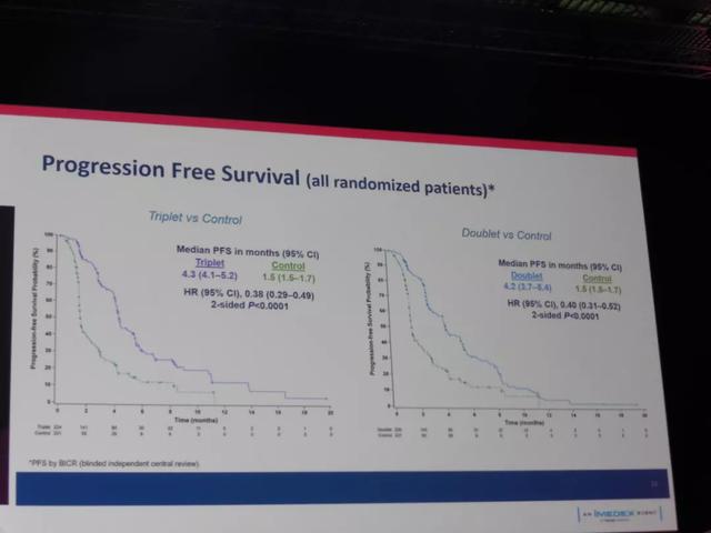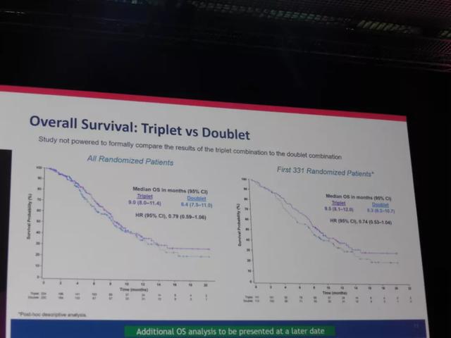 而通过垂直抑制,我们可以在EGFR和BRAF水平的不同步骤阻断相关途径,并在MEK水平进一步阻断下游相关途径。几项小型Ⅰ期和Ⅱ期研究以及BEACON的前期研究已经证实了其有效性,该研究于今年发表在临床肿瘤学杂志上,结果非常令人鼓舞,48%在BEACON前期阶段接受治疗的患者表现出缓解率和15.3个月的中位总生存期。BEACON CRC研究的完整数据在本次会议上报告。我们知道,接受三联疗法(binimetinib,encorafenib和西妥昔单抗)的患者中位总生存期为9个月,而对照组为5.4个月。就EGFR抑制剂西妥昔单抗和BRAF抑制剂encorafenib的双药联合结果而言,与对照组5.4个月的总体生存率相比,双药联合组的总体存活率为8.4个月,略低于三联疗法。因此,三联疗法似乎略微优于双联疗法,但我们仍需要通过更多的后续研究来探索毒副作用。总之,我们第一次看到针对BRAF V600E突变的个性化治疗在低风险BRAF突变的患者中带来了实际的生存获益。