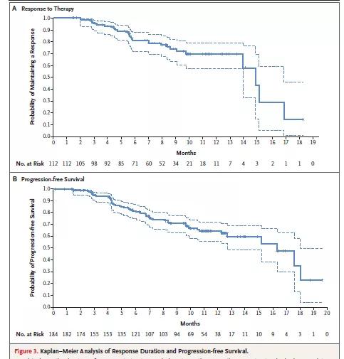 如图2所示,A组显示了在184名参与研究的患者中,112名完全或部分缓解的患者接受DS-8021治疗的反应持续时间;B组显示了总体人群中无进展生存率。